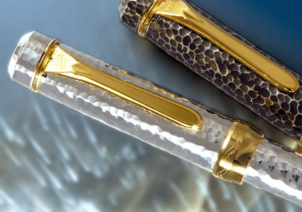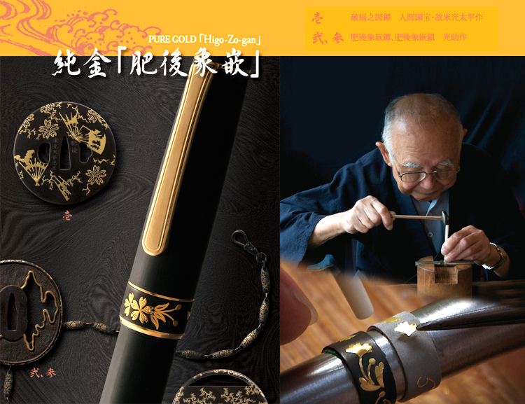 重厚で雅味ある「肥後象嵌」は赤サビから生まれた地鉄の美しい黒と、華麗に装飾された純金と、熟達の職人技が惜しみなく注がれた精緻な逸品です。象嵌の「象」は、かたどることを意味し、「嵌」は、はめ込むことを意味します。英語では象嵌はDamascene(ダマシン)と呼ばれ、この言葉はこの技術の発祥とされるダマスカス(8世紀・シリア)から来ており、その技術はシルク・ロードを介して遥か極東の日本にまで伝わりました。長い伝統を誇る肥後象嵌を万年筆と複合筆記具に施しました。