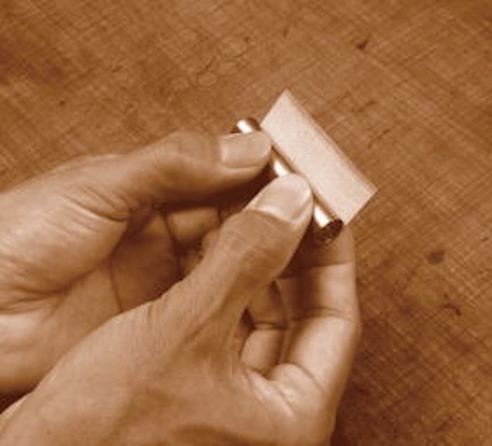 一般のセルロイド等のペンは、約2cm四方の角材を旋盤等で切削(くり抜き)していますが、当社では板を巻く独自の方法をとり続けています。