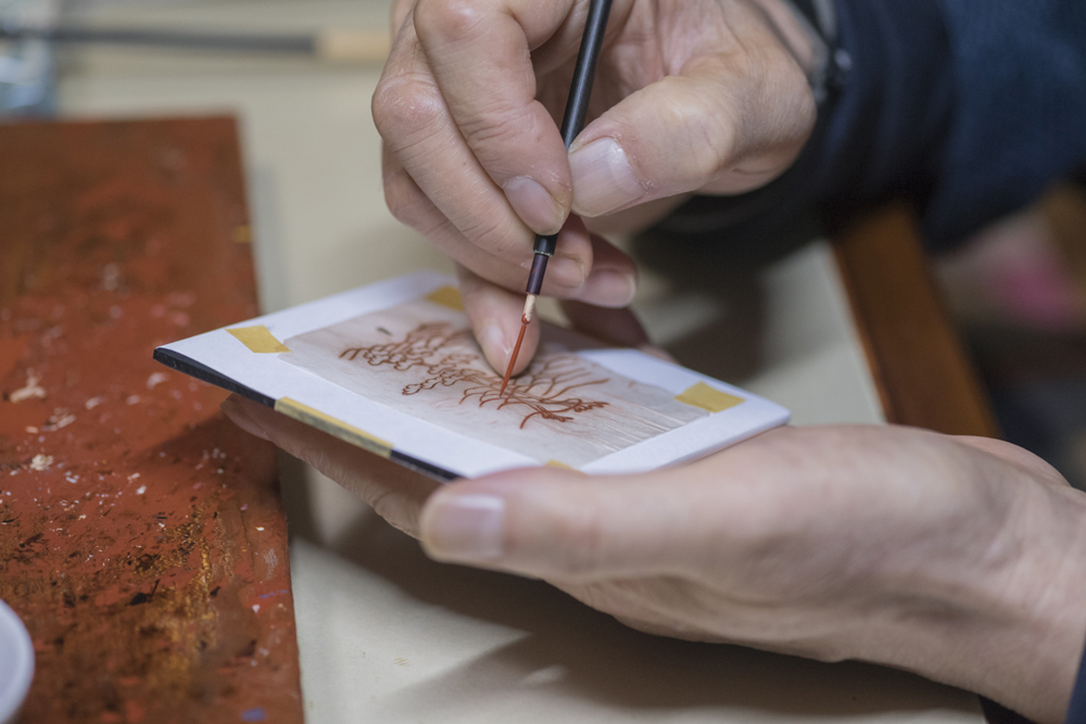 蒔絵(まきえ)とは、その名前のとおり「蒔く(まく)絵」という言葉から起こり、下塗りや絵付け、色付けなどの後に金粉を蒔いて散らし、立体感や豪奢なイメージを出す工程のことを指します。また、これらの工程の前に下塗り、後の上塗り次第で全体の出来栄えに大きな影響をもたらし、上塗りの後の研ぎ出し(ときだし:表面を研ぐことにより平滑にする)工程が最終的な作品の巧拙を決定します。なお、装飾として金粉以外に箔や切り金(きりがね:箔よりも厚みのある板状の材料)を使用する平文(ひょうもん)技法、卵殻(らんかく:白の色の方言するためにうずらや鳥の卵を細かく刻んだもの)、夜光貝やアワビなどの貝を埋め込んだ細工などは技法としての蒔絵とは区別されます。また、作品の表面を掘り込み、その部分に粉や箔を落とし込む沈金とも区別されています。