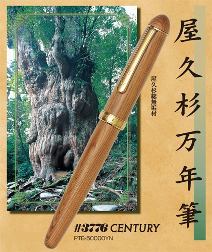 屋久杉とは、屋久島の亜熱帯性気候と年間降雨量1万ミリという多雨に恵まれ、又台風の 目抜き通りに位置し、数千年もの風雪に耐え抜いて育った樹齢1000年以上の杉を屋久杉と呼んでいます。現在では自然保護の為、天然記念物に指定され、伐ることは禁止されて いますが、江戸時代に伐採された切り株や台風で倒れた倒木が屋久杉工芸品の材料として使われています。長い年月と厳しい自然の中で育った為、年輪が緻密で屋久杉が織りなす 秀麗な木目、堅牢できめ細かく美しい色艶が長寿の銘木として今や世界で珍重されています。この自然の芸術の極致とも言える材料を、当社では特に樹齢3000年の厳選された屋久杉をボディーに使用し、名匠によるアートとも呼べるクラフト技術にて美しい色合いの 木目など、1本1本異なる材料の良さを活かした万年筆を完成致しました。自然保護法等 の規制もあり、希少価値は更に高まるものと思われます。