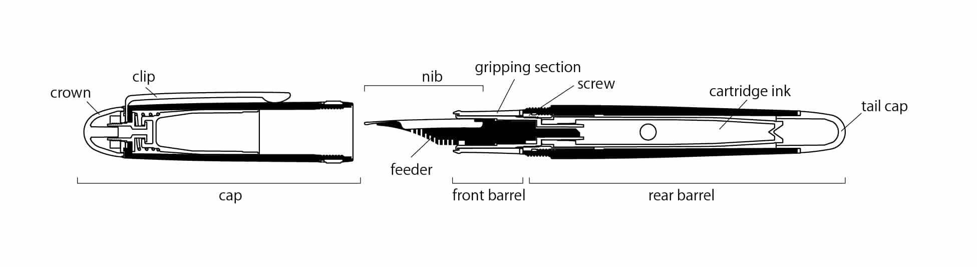 A commonly used fountain pen consists of six parts: a pen, the core, the neck, a shaft, a cap, and a cartridge ink.