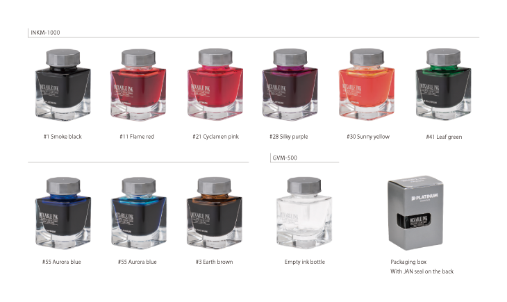 ● A total of nine colors of inks for fountain pens that let you create the color of your choice. Each ink produces great color when used alone too, bringing out a beautiful and unique ink color.