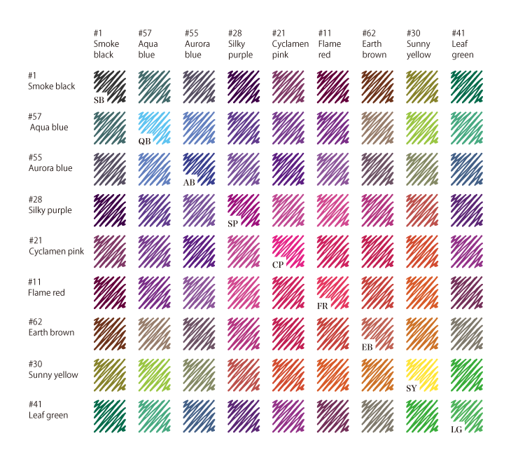 ・Ink color:#1 Smoke black / #11 Flame red / #21 Cyclamen pink / #28 Silky purple / #30 Sunny yellow / #41 Leaf green / #55 Aurora blue / #57 Aqua blue / #62 Earth brown