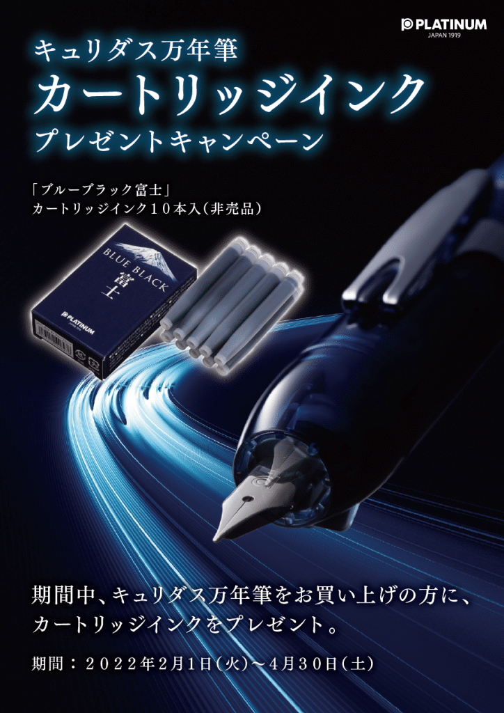 キャンペーン実施店舗で期間中、キュリダスお買い上げの方に「ブルーブラック富士」インクカートリッジ(非売品)」をプレゼントいたします。