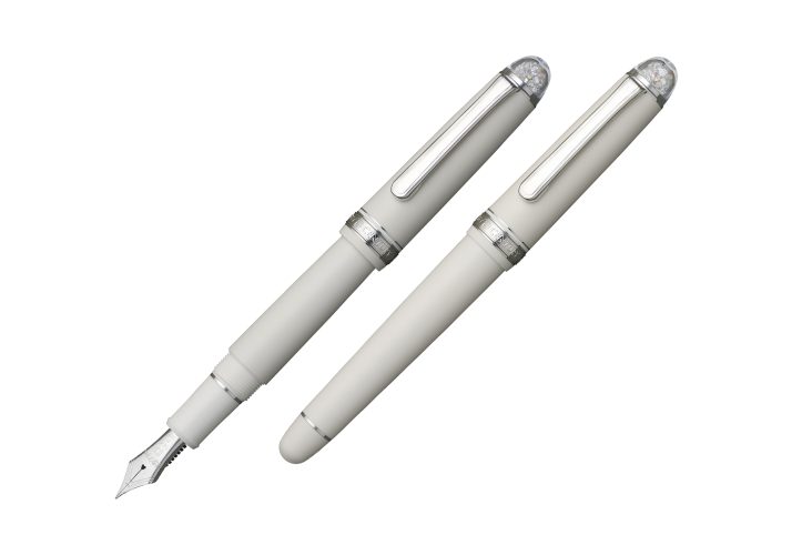 プラチナ万年筆株式会社(本社: 東京 社長: 中田俊也)は、2022年、インク鮮度を保ち続けるスリップシール機構を搭載した万年筆としてご愛顧いただいている「#3776センチュリー」の特別限定モデル『シェイプ・オブ・ハート』を発売。おかげさまでご好評いただき、このたび第2作目として『シェイプ・オブ・ハート イヴォワール』を発売します。第1作目と同様に、ペン先のハート穴の加工で発生するハート型の抜き片(以降ハートピース)に思いを馳せ、そのハートピース2葉を天冠ドームの中にジルコニアと共におさめました。一般的にハートピースは、金の材料として再利用するために集めて溶かされてしまいますが、『シェイプ・オブ・ハート』ではそれが1本の万年筆に同居しているという想いのもとに創られました。第2作目では、ロジウムフィニッシュの14金ハートピース2葉を天冠ドームにしのばせました。合わせてペン先やクリップ・金属トリムもロジウムフィニッシュで装飾。さらにブラスト加工を施したマットホワイトボディを採用。万年筆全体の輝きにコントラストを与え、天冠ドームを一層引き立てます。こちらも第1作目同様に通常の商品ラインアップにはない限定モデルならではの構成となっています。天冠ドームの中におさめられた2葉のハートピースは、恋人やパートナーとの繋がりを感じさせます。ロマンチックなストーリーを添えて、大切な人への贈り物としていかがでしょうか。#3776 センチュリー「シェイプ・オブ・ハート」限定数量 2,000 本