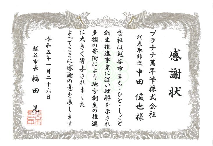 当社万年筆製造の中核を担う越谷センター所在地である埼玉県越谷市に企業版ふるさと納税による寄付を行いました。