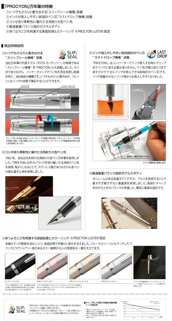 「PROCYON LUSTER」ではポップなカラー展開から一転し、大人のための質感を追求。触り心地の良い 2 種類の表面処理 とラグジュアリーなカラーバリエーションを用意。トップ(天冠)をクロームフィニッシュで装うことで華やかさが一層高まり、 フォーマルシーンにもおすすめの1本として仕上がりました。 いつでもさらりと書き出せる「スリップシール機構」と最後の一滴まで吸入できる独自設計のペン芯「ラストドロップ機構」を搭載。最適重量バランス設計のメタルボディと五角絞りのペン先は「書くよろこび」を刺激し、触感にこだわった表面処理と華やかなスタイルは「持つよろこび」を刺激します。